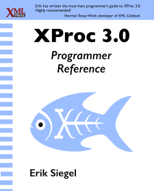 XProc is een programmeertaal voor het verwerken van XML, JSON en andere soorten documenten in pipelines. Verwerking vindt plaats door het koppelen van losse stappen zoals conversies tot één geheel. Documentstromen kunnen worden gesplitst en samengevoegd. Toepassingen zijn vooral te vinden in vakgebieden met een complexe document verwerking, zoals uitgeven, documentatie en XML gebaseerde standaarden. Het is uitgegeven door XML Press in 2020. |